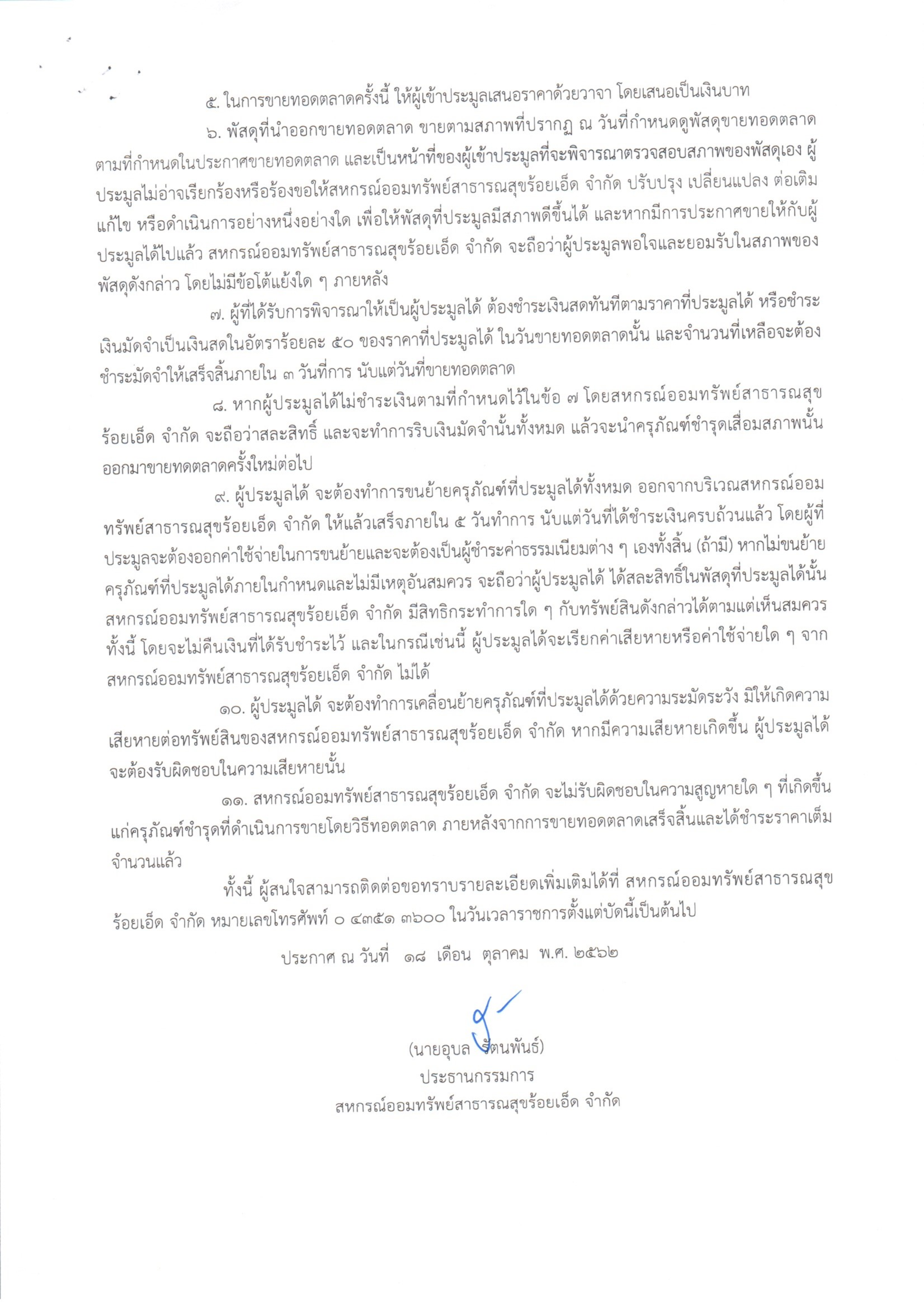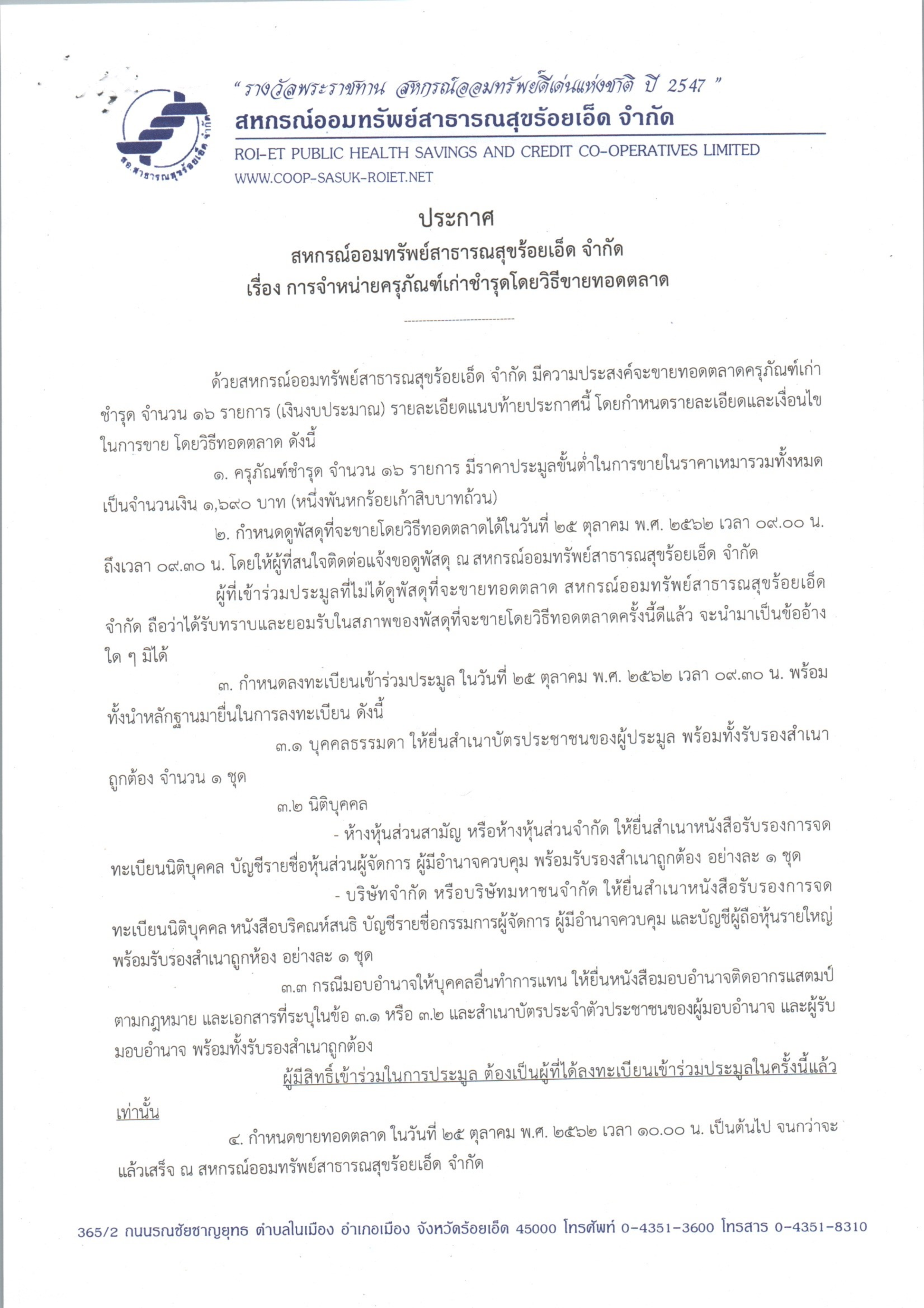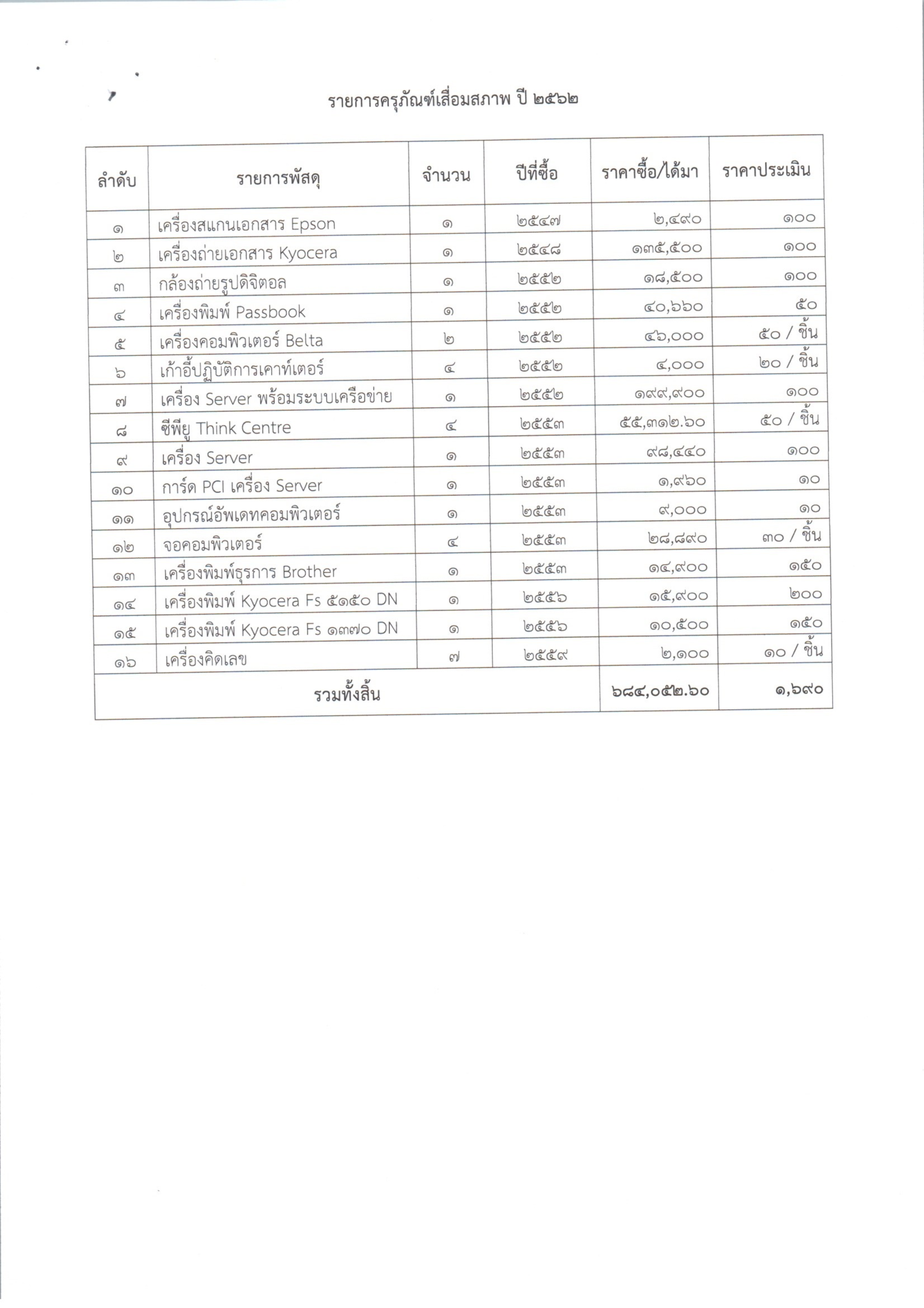 ประกาศ การจำหน่ายครุภัณฑ์เก่าชำรุดโดยวิธีขายทอดตลาด