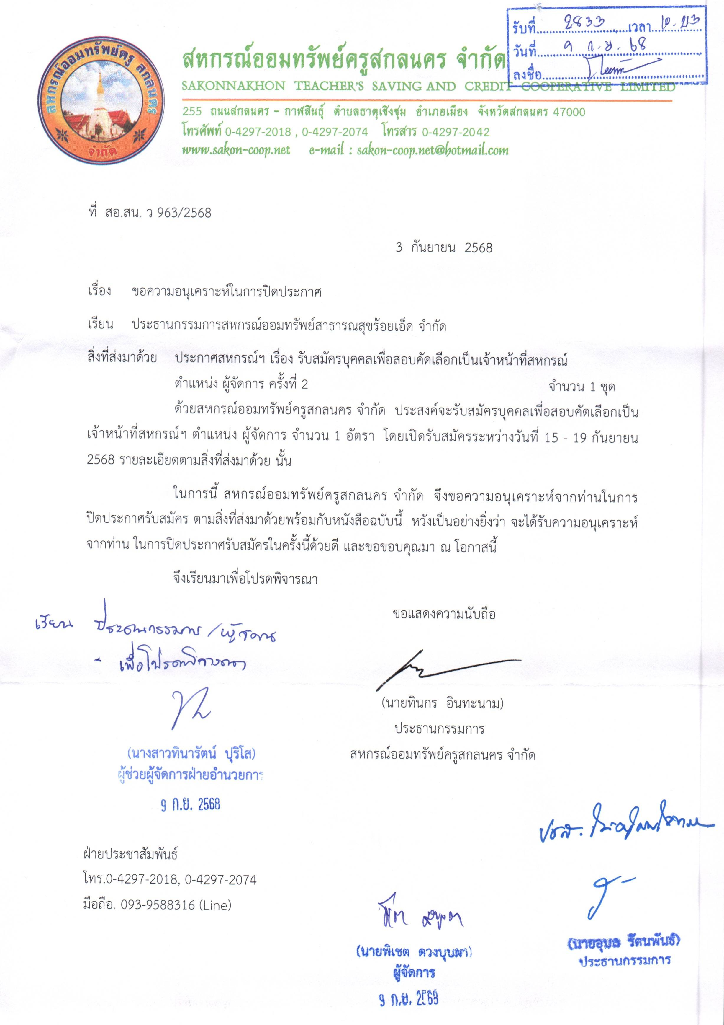 ประกาศรับสมัครผู้จัดการ สอ.ครูสกลนคร จำกัด