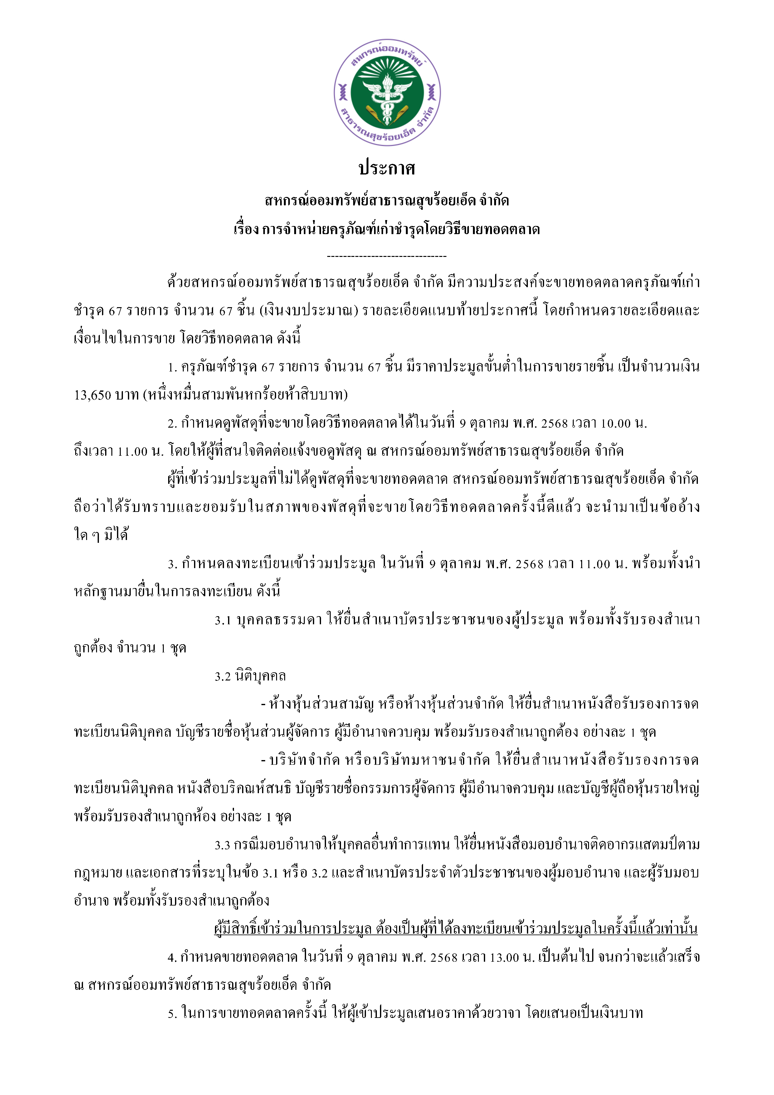 ประกาศ การจำหน่ายครุภัณฑ์เก่าชำรุดโดยวิธีขายทอดตลาด