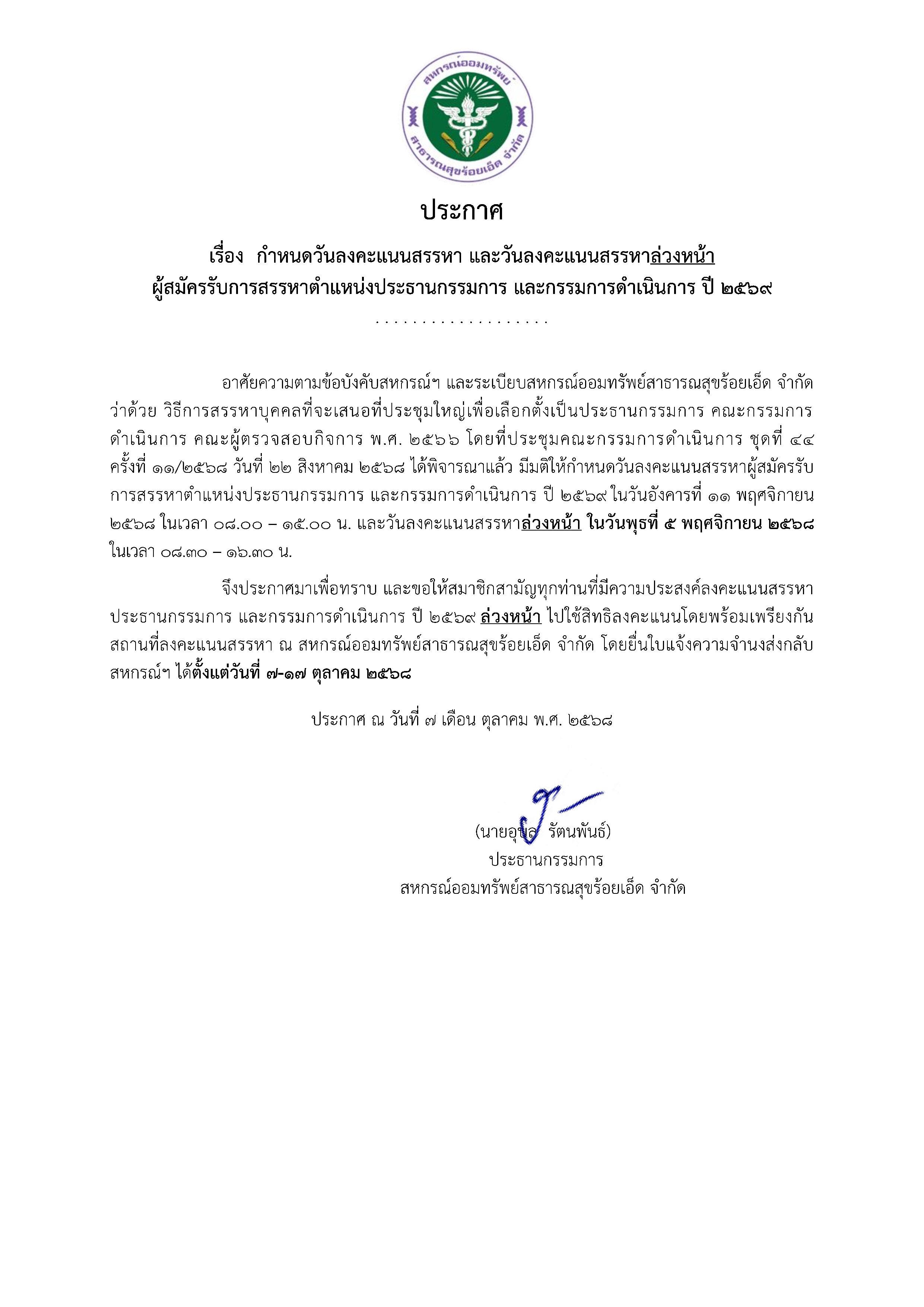 ประกาศ กำหนดวันลงคะแนนสรรหาล่วงหน้า ผู้รับสมัคร ประธานกรรมการ และกรรมการดำเนินการ ประจำปี 2569