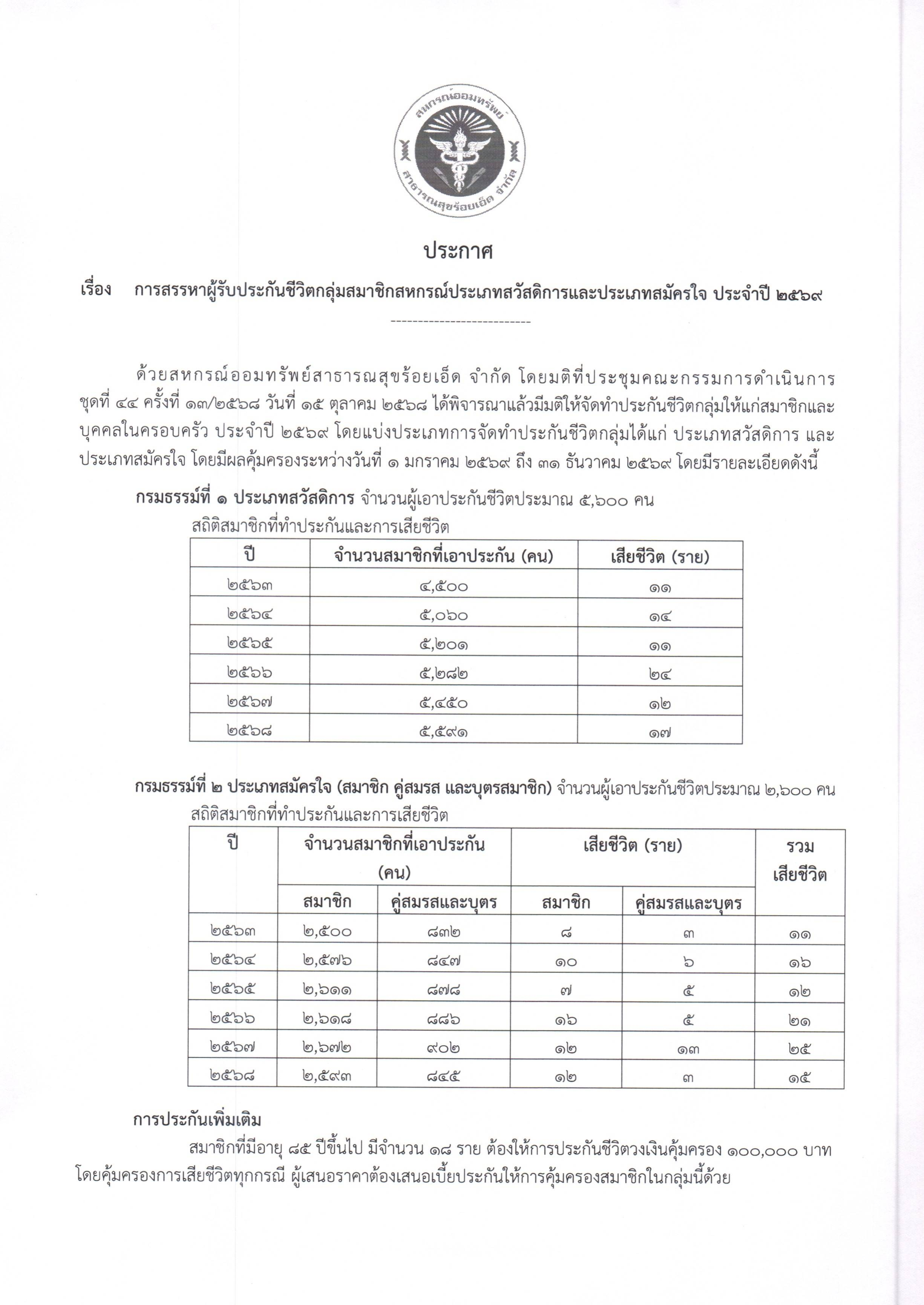 ประกาศ สรรหาผู้รับประกันชีวิตกลุ่มสมาชิกสหกรณ์ประเภทสวัสดิการและประเภทสมัครใจ ประจำปี 2569