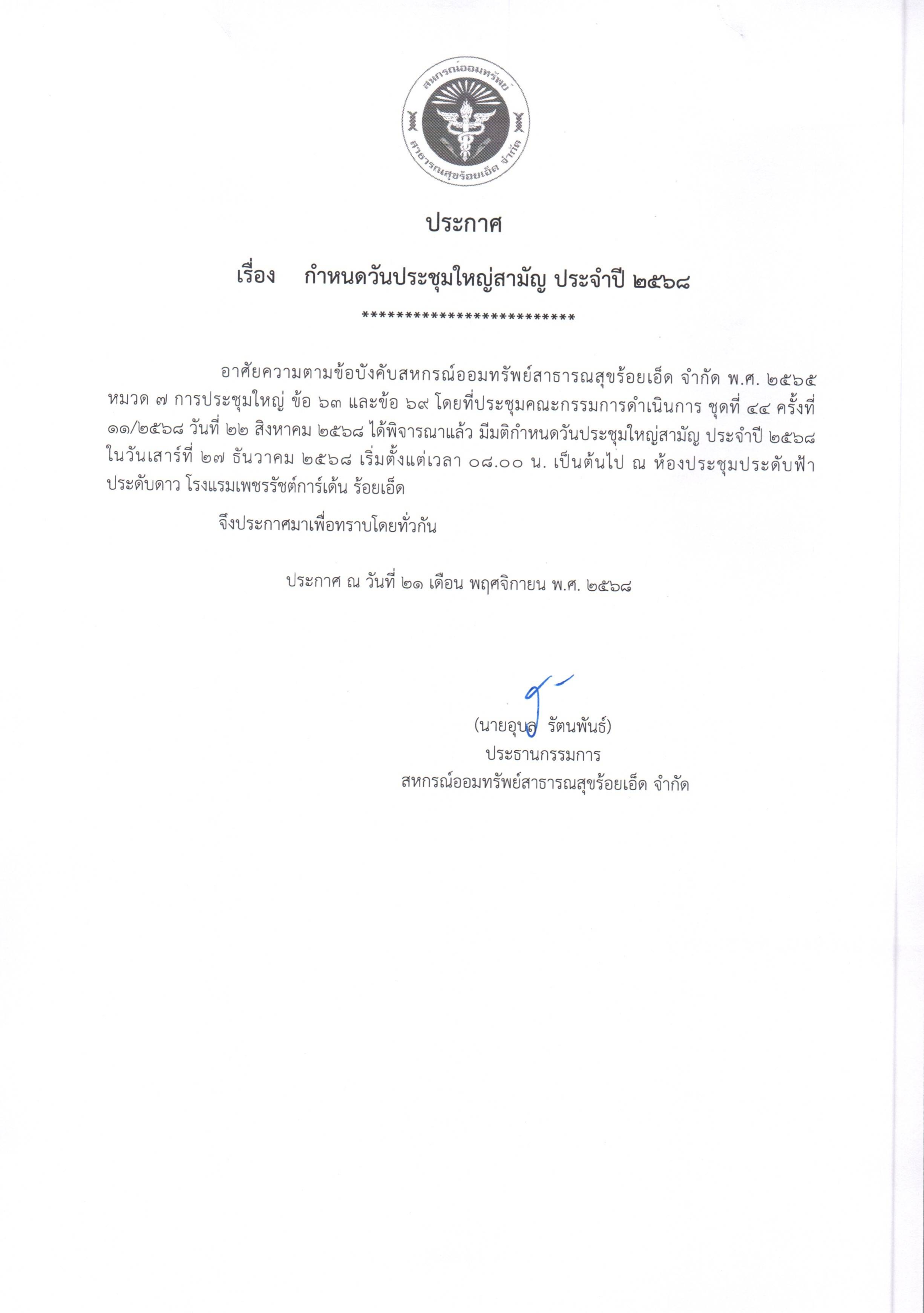 ประกาศ กำหนดวันประชุมใหญ่สามัญ ประจำปี 2568